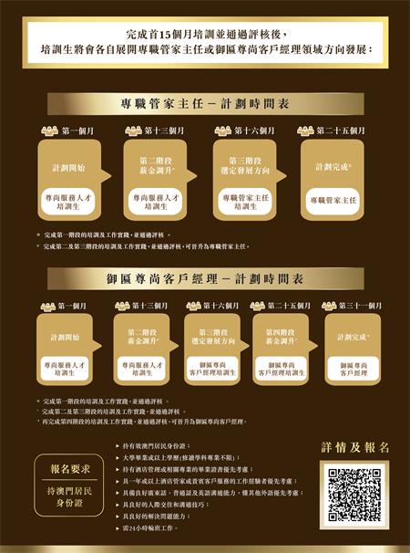該計劃提供12個“尊尚服務人才培訓生”職位空缺,獲計劃錄取者將由金沙中國安排接受專業培訓及工作實踐,在完成首15個月培訓及通過考核後,獲錄取者可按個人意願及部門評估,選定以“專職管家主任”或“御匾尊尚客戶經理”作為後續發展方向。選擇“專職管家主任”者需接受餘下9個月的培訓;選擇“御匾尊尚客戶經理”者則需完成餘下15個月培訓。