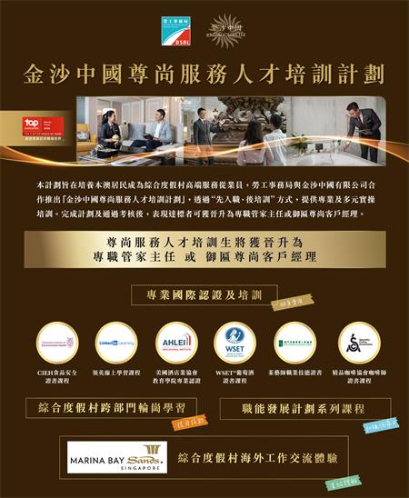 【本報訊】勞工事務局(下稱“勞工局”)與金沙中國有限公司(下稱“金沙中國”)合作推出“金沙中國尊尚服務人才培訓計劃”(下稱“計劃”),以“先入職、後培訓”方式,協助本澳居民提升專業技能與促進其職業生涯向上流動,該計劃由明(31)日起接受網上申請。