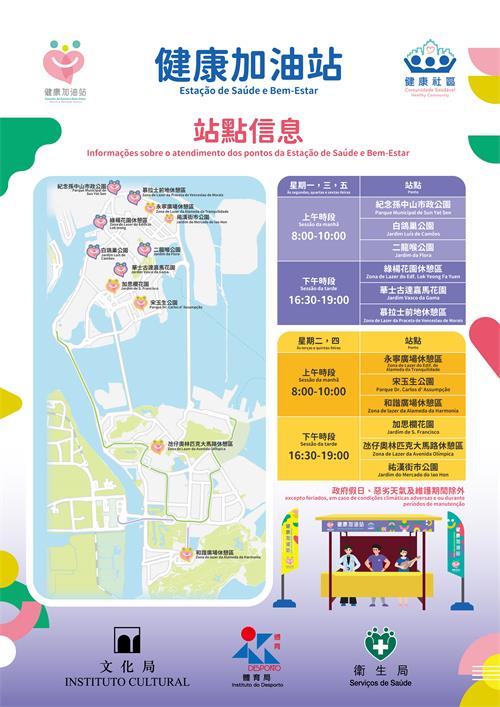 為進一步擴大社區健康服務的覆蓋範圍,落實“資源下沉”,第二階段聯同澳門街坊會聯合總會、澳門執業西醫公會及多個文化社團等機構共同協作,優化現場服務,讓健康資源融入社區生活場景,實現“隨手可得、隨心即享”。站點數量由首階段全澳8個擴展至12個,形成更密集的社區健康服務網絡,新開設的4個站點均選址於居民日常聚集的公共空間(開放安排詳見附圖海報),包括: