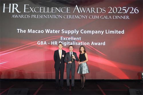 【本報訊】日前,澳門自來水在香港人力資源管理學會舉辦的“卓越人力資源獎2025/2026頒獎典禮”中,榮獲大灣區類別“人力資源數碼化金獎”。獎項充分肯定公司在推動人力資源數字化轉型、打造敏捷高效及以員工為本的管理體系等方面的卓越表現。與此同時,公司亦榮獲特區政府頒發“健康企業嘉許”,肯定了公司在推動員工福祉、優化職場健康方面的持續努力。