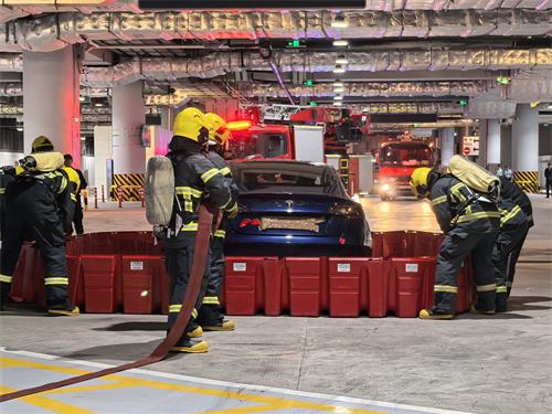 消防員組裝拼合水池圍封車輛,模擬注水浸泡降溫。