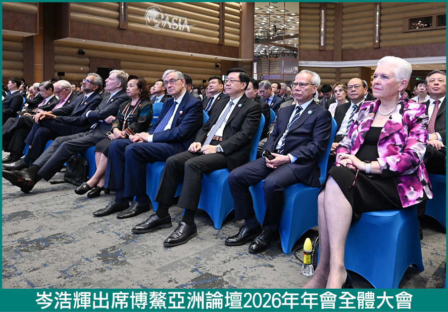 【本報訊】行政長官岑浩輝3月26日上午出席博鰲亞洲論壇2026年年會全體大會,聆聽中共中央政治局常委、全國人大常委會委員長趙樂際發表的主旨演講。