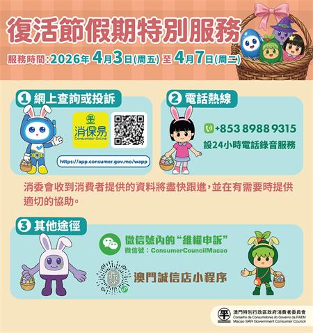 【本報訊】消費者委員會配合復活節連假,由43日至7日設假期特別服務,為消費者提供查詢或投訴服務。