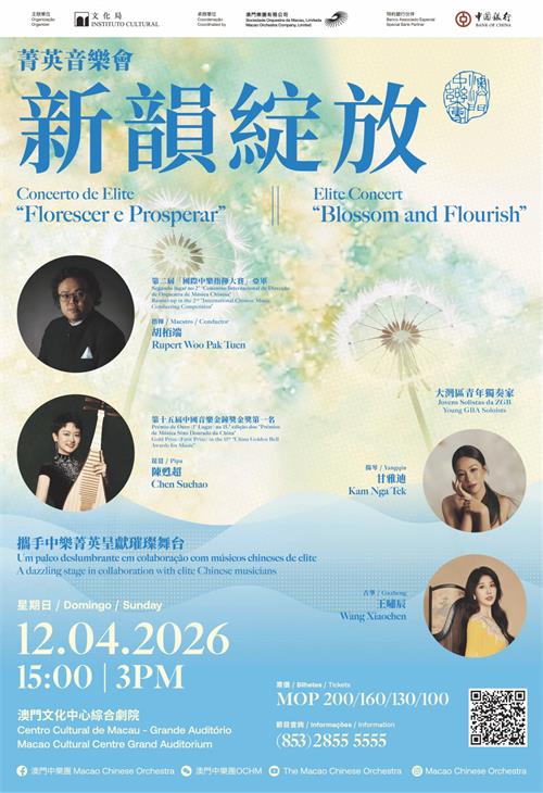澳門中樂團2025-26樂季由文化局主辦,澳門樂團有限公司承辦,澳門中銀支持。《新韻綻放》菁英音樂會演出時間連中場休息約1小時30分鐘,門票現於澳門售票網公開發售,票價為200、160、130及100澳門元。觀眾可透過澳門售票網購票,24小時訂票熱線2855 5555;網上訂票www.macauticket.com。