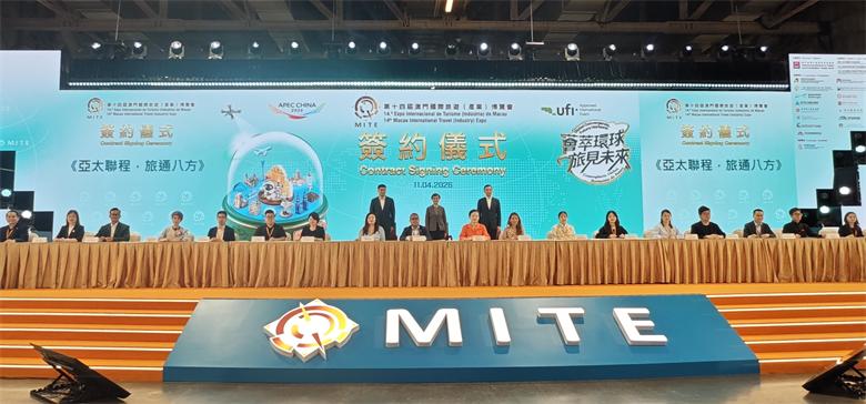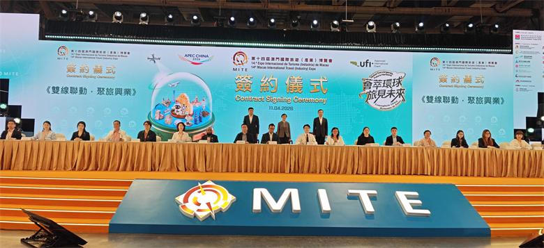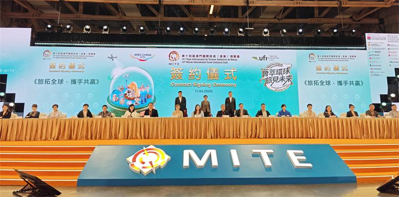【本報訊】第十四屆澳門國際旅遊(產業)博覽會今(11)日下午於展館主舞台舉行簽約儀式。活動合共達成60份合作協議,內容涵蓋聯程、拓全球、數智、醫旅、線上下、絲路的六組合作領域,旨在凝聚發展及合力深化行業協同,為旅博會的高質量舉辦,以及旅遊產業的跨界融合注入新的力量。澳門旅遊局局長文綺華,澳門中聯辦經濟部副部長楊全州,澳門旅行社協會會長劉雅煌出席並見證簽約過程。