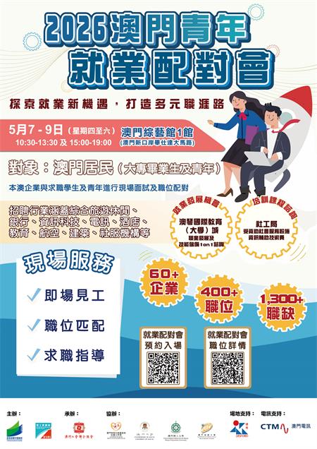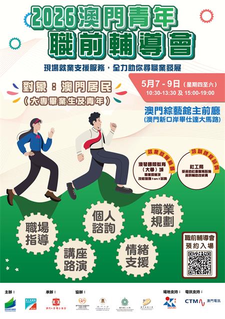 【本報訊】為協助澳門青年順利開展職業生涯及投入就業巿場,由教育及青年發展局和勞工事務局主辦、澳門工會聯合總會承辦的2026“澳門青年就業配對會”(下稱配對會)及“澳門青年職前輔導會”(下稱職輔會),將於2026年5月7日至9日一連三日於澳門綜藝館舉行。配對會及職輔會兩項活動由2026年4月21日起可於網上預約及報名。