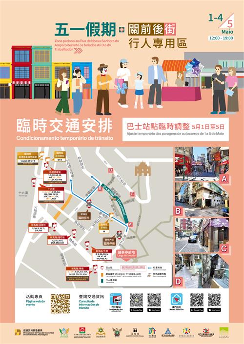巴士服務方面,5月1日至4日每日早上11時至尾班車,氹仔舊城區四個巴士站將臨時停用,多條巴士路線需改道行駛,乘客可改用臨時站或周邊站點上落;另外,毗鄰關前後街區域的巴士路線則維持正常運作。因應節日期間新馬路的臨時巴士措施,5月1日至5日期間,途經草堆街的巴士路線全日實施臨時靠站安排。交通事務局已指示兩巴於客流高峰站點加強指示及增派人員協助分流乘客,並密切監測各站點候車情況,適時採取調度措施,確保公交交通有序運作。
