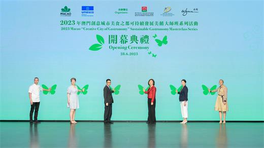 “2023澳門創意城市美食之都可持續發展美餚大師班系列活動”開幕式昨日假永利皇宮宴會廳圓滿舉行,吸引逾百人參與。永利渡假村(澳門)股份有限公司總裁兼常務董事陳志玲在致辭中表示:“永利一直重視糧食持續性發展及生態保育,致力以負責任的方式運用地球上寶貴的資源。永利餐飲學院多年來在不斷為本澳的餐飲從業員和廚師提供高水準培訓的同時,更大力推動食材及美食烹調的可持續性發展,豐富澳門的多元飲食文化。”