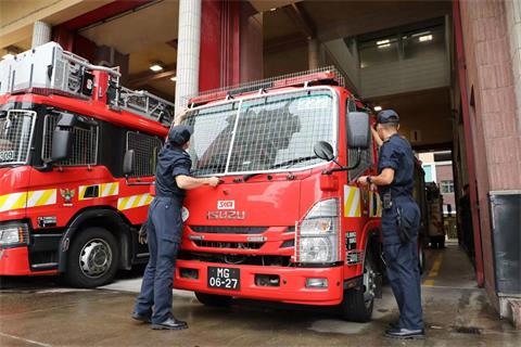 消防局人員於颱風前檢查站內設施、救援工具及緊急車輛等正常運作。