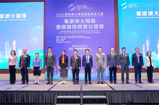 【本報訊】以“一會展三地”辦展新模式舉行的“2023粵港澳大灣區服務貿易大會”在澳門的分會場——“粵港澳大灣區會展旅遊經濟分論壇”今(7)日假澳門銀河國際會議中心展開。廣東省商務廳廳長張勁松、珠海市市長黃志豪、澳門貿易投資促進局主席余雨生、廣東省文化和旅遊廳副廳長趙紅,以及近200位粵港澳會展行業菁英、專家、學者,參與,圍繞“重新鏈接,多元會旅”主題,展開3場主題演講和2場圓桌對話。