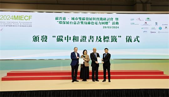 今年澳門環保展繼續成為碳中和專業展會,更透過澳門展貿協會及澳門低碳發展協會成功申請《碳中和會展及活動標籤》,在研討會頒授儀式上林中賢和廣州碳排所權交易中心副總經理何煒向展覽承辦方代表澳門貿促局執行委員黃伊琳和澳門環保局副局長葉擴林授予《碳中和會展及活動標籤》和《碳中和證書》。