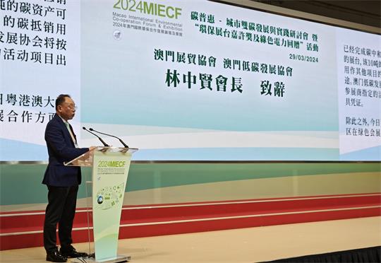 【本報訊】由澳門展貿協會及澳門低碳發展協會合辦的“碳普惠 - 城市雙碳發展與實踐研討會”暨“環保展台嘉許獎及綠色電力回贈”活動於今(29)日下午在2024年澳門國際環保合作發展論壇及展覽(MIECF)舉行,活動中還進行了《粵港澳大灣區會展碳中和標準聯合倡議》簽署儀式、2024MIECF碳中和證書及標籤頒發儀式。