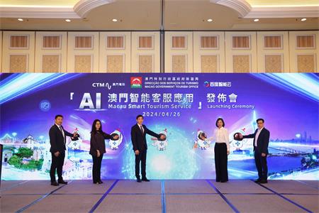 AI澳門智能客服應用發佈會”26日下午假澳門國際旅遊(產業)博覽會會場威尼斯人那不勒斯宴會廳舉行,旅遊局副局長許耀明、澳門電訊商務副總裁湛寶儀及商業服務、拓展總監吳振德、百度集團副總裁袁佛玉、百度智能雲南部地區總經理段巍擔任主禮嘉賓。